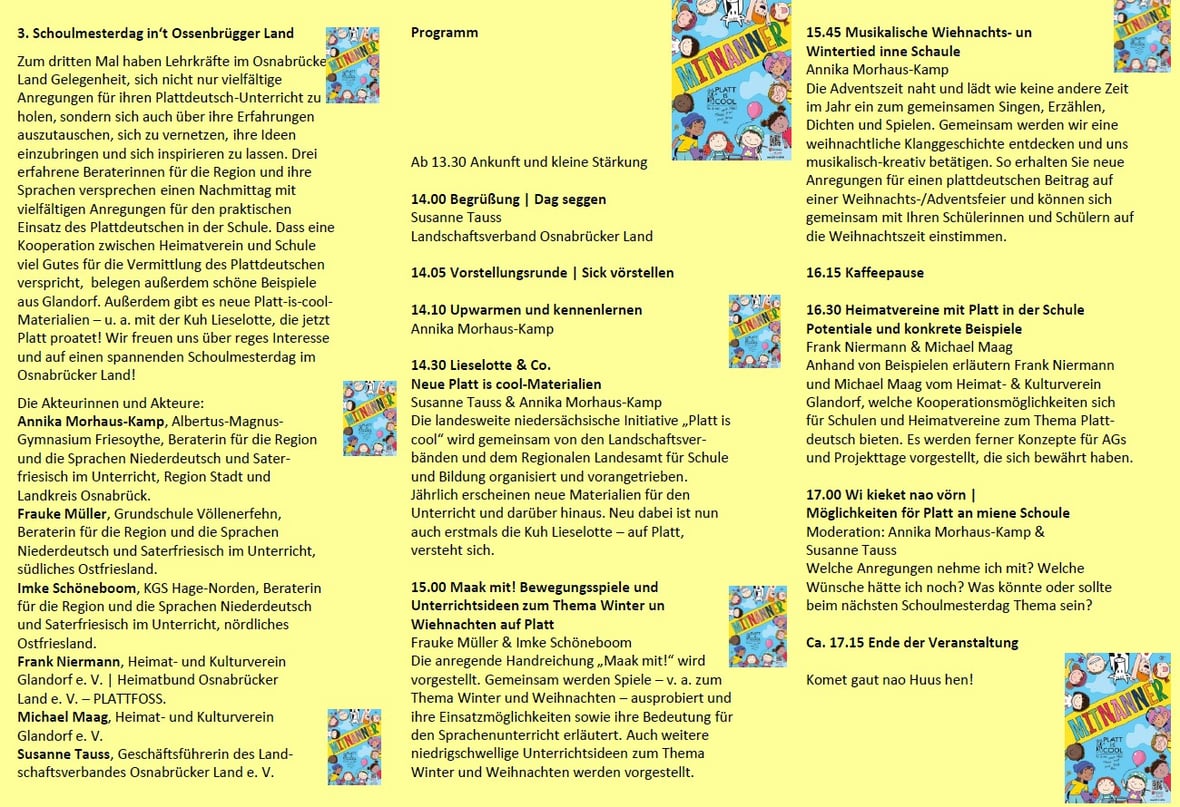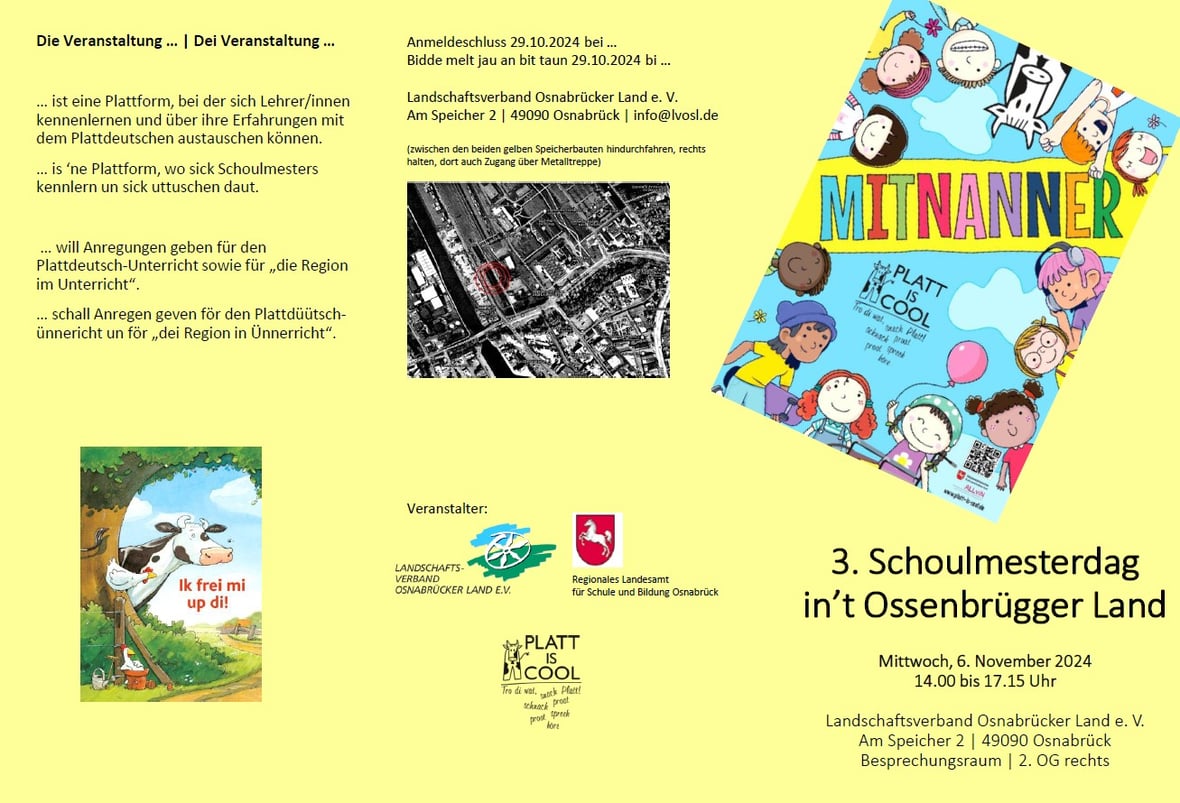 Ok 2024 gifft dat weer Angeboden van de Lüneburgische Landschaftsverband – un dat is good so! Platt lehren („mit leichten Vorkenntnissen“), Philosophie up Platt, Actionbounds, Singen & Spelen mit Kinner, Arbeiden mit Nele Ohlsen hör „Plattsnack“, Platt in de Kinnergaarn, … un de Schoolmesterdag. All dat un noch wat mehr steiht 2024 up de Plaan, de hier to finnen is. Besten Dank an all de Referentinnen un Referenten un an Almuth Kölsch!