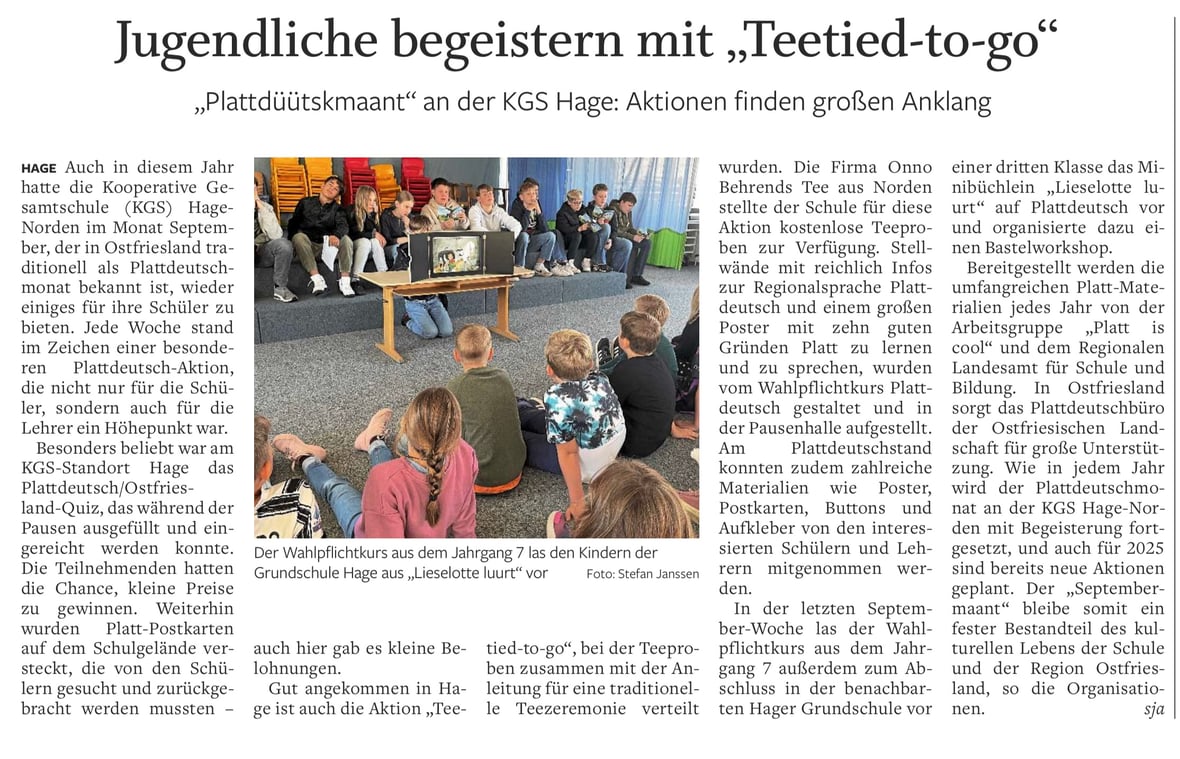Kinder der Grundschule Osterscheps (OT von Edewecht) erhielten kürzlich besonderen Plattdeutschunterricht: Unterrichtet wurden sie von Schülerinnen und Schülern des Platt-WPK der OBS Edewecht. Diese hatten sich gründlich vorbereitet. Dass dies zum Erfolg führte, zeigt dieser kleine Bericht von Henning Pickert: