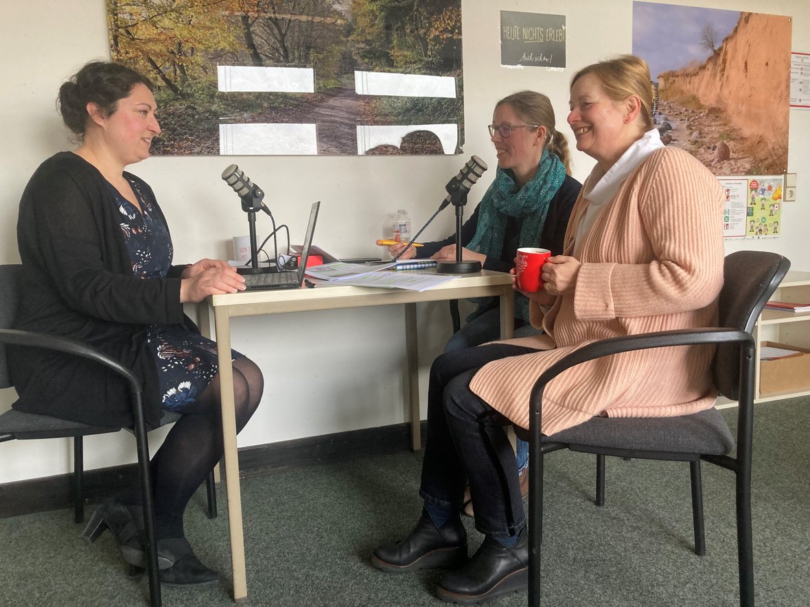 Mareike Wellmeier lässt sich von Wiebke Erdtmann und Gabriele Scheel (v. l. n. r.) etwas über die Niederdeutsch- und Saterfriesisch in den Schulen Niedersachsens erzählen. Un dat is en Pläseer!