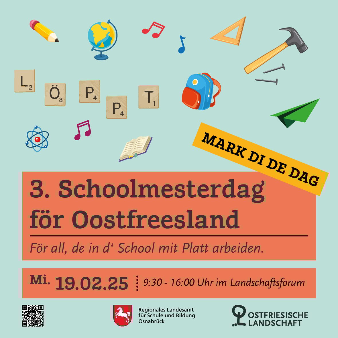 „För all, de in dʼ School mit Platt arbeiden.“ So dat slichte, aver gode Motto van de 3. Schoolmesterdag för Oostfreesland, de an de 19. Februar stattfinnen deit. An de Vör- un Namiddag gifft dat Workshops, middags wat to eten un Materiaal un tüskenin immer weer Lüü, mit de man wunnerbaar in ʼt Gespreek komen kann. Anmellen kann man sük nu al hier. Bi Fragen bitte an Beraderin Imke Schöneboom (Imke.Schoeneboom@RLSB.de) wennen.