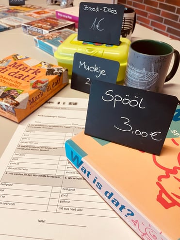 An de 24. Määrt hett in Ihlow an de IGS (Hermann-Tempel-School) dat eerste Sprakendörp up Engelsk, Franzöösk un up Plattdüütsk stattfunnen. De Prüfung is en vollwertigen Ersatzleistung för en schriftlichen Test, schrifft uns Platt-Mesterske Anja Enninga, de de Dag tosamen mit Imke Schöneboom (KGS Hage-Norden) un Martina Brietzke (GS Simonswolde) vörbereidt un dörföhrt hett. Tosamen wassen dat veer Stationen („In ʼt Kino“, „Up Koffjevisiet“, „Up de Flohmarkt“ un „Bi de Touristeninformation“, waar de Kinner hör Könen un Weten bewiesen kunnen. – Imke hett flietig an de Kino-Kass stahn un daar mithulpen - un se hett en paar mooi Biller maakt: völen Dank!