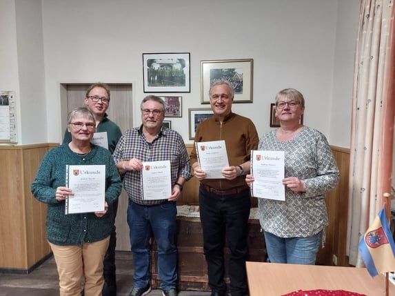 Zum Bild rechts: Fünf der acht Kursteilnehmenden zeigen stolz ihre Urkunden. Von links: Annet Busser, Stefan Wallschlag, Siegbert Blank, Bouke Slofstra, Andrea Hilwers. Es fehlen: Sieglinde Lüken, Sandra Krause und Edith Sassen; Foto: Veronika Pugge/Seeltersk-Kontoor