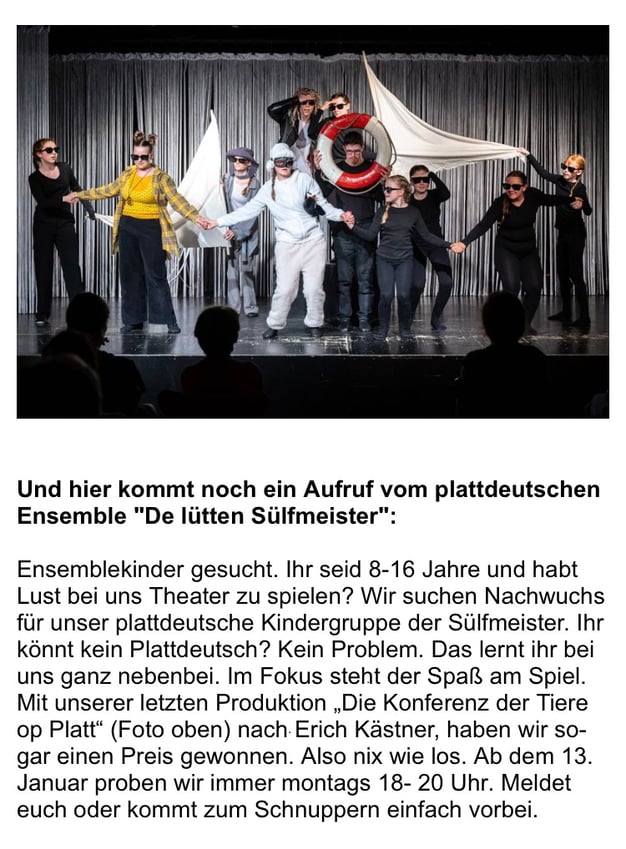 Inʼe Sommertiet gifft dat in dat Land twüschen Elv un Werser dree Schooltheaterdaag: Anʼn 22. Mai 2024 inʼe Grundschool Balje, anʼn 12. Juni 2024 inʼe Grundschool Falkenbarg in Leʼendahl (Lilienthal) un anʼn 19. Juni 2024 en Geschichtstheoterdag op den Lilienhoff in Worphusen. Dor gifft dat toʼn Bespreken un Vörbereiden anʼn 15. Mai 2024 en Theaterfortbillen. Informatschonen dorto köönt ji in unnern finnen (tosamen söss Word-Dateien) or de gifft dat bi Andrea Schwarz (Andrea.Schwarz@rlsb.de or schwarz@landschaftsverband-stade.de). Dor kann een sik ok anmellen.